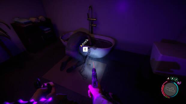 Dentro de esta habitación tienes que ir hacia el cuarto de baño que hay al fondo, ya que es ahí donde vas a encontrarte con el arco compuesto. Lo puedes ver apoyado en la bañera donde hay un cadáver, como en esta imagen: