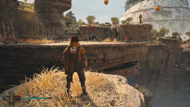 Desde esta zona, vuela con el Planeador hacia la choza abandonada que hay al otro lado del abismo y busca en un lateral de la caseta una tapa que puedes alzar con la Fuerza para dejar al descubierto una especie de agujero como el que ves en esta imagen: