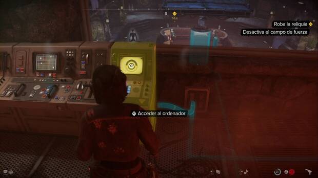 Terminarás por pasar una estrechez y llegar a un canal con una entrada de ventilación que te deja en una cocina. Ojo porque aunque no lo indican, esto es zona restringida del Alba Escarlata, si te pillan pierdes reputación. Deja inconsciente al primer guardia y luego piratea la puerta. Empieza por despejar la planta superior, no tendrás grandes problemas para pillar a los guardias por sorpresa. No olvides ir recogiendo objetos hasta llegar a la sala del otro lado. Encontrarás un terminal que debes piratear para desconectar la seguridad de la reliquia.