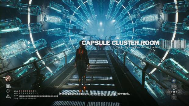 Para llegar a la puerta, retrocede al pasillo y gira a la derecha dos veces. Llegarás a una enorme sala en forma de tubo con cápsulas.