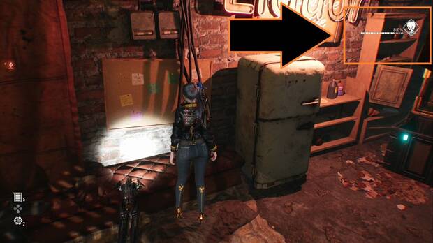 Avanza por el parking, usando el escáner para ver otra caja en una esquina y sube la rampa del fondo, donde la luz roja. Al fondo de la planta superior hay otra caja, pero para avanzar debes ir por el pasillo del Percebe y salir por el hueco en la fachada, descolgándote por los salientes.