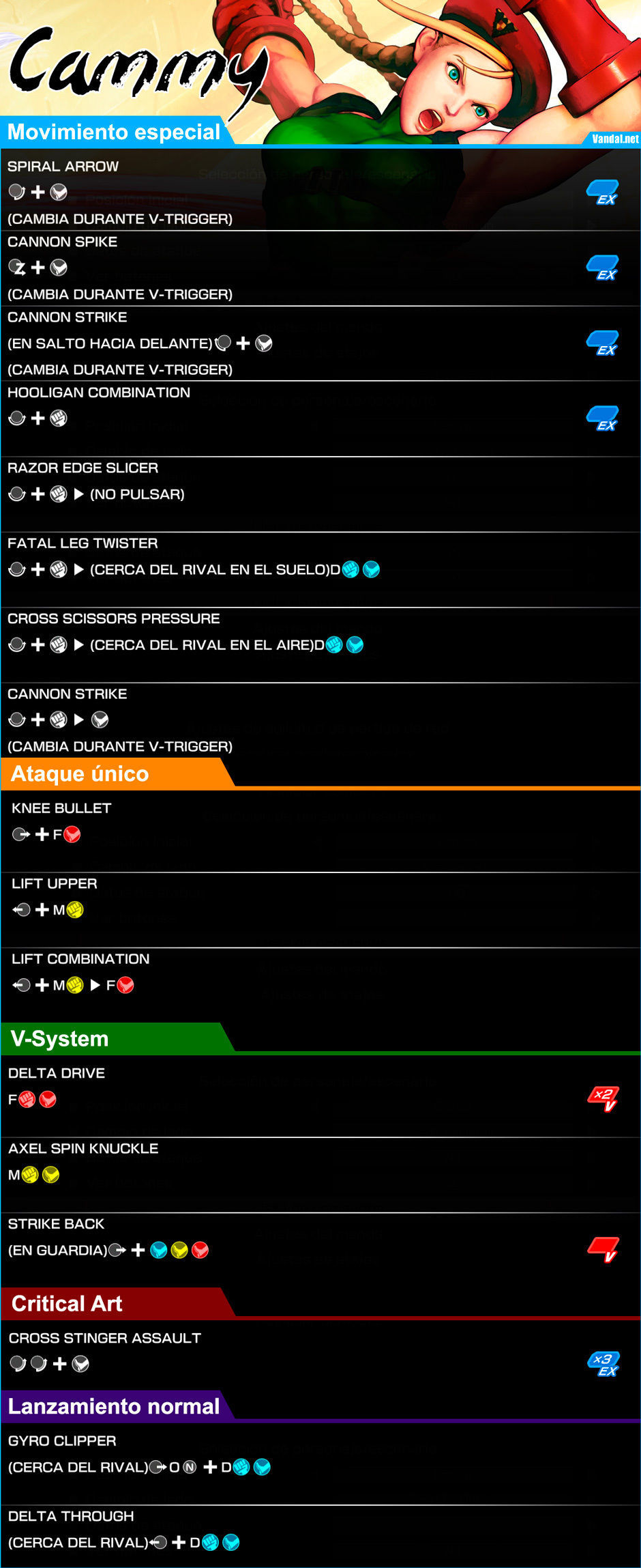 - Durante el V-Trigger de Cammy, no podemos realizar las versiones EX de Spiral Arrow y Cannon Spike.