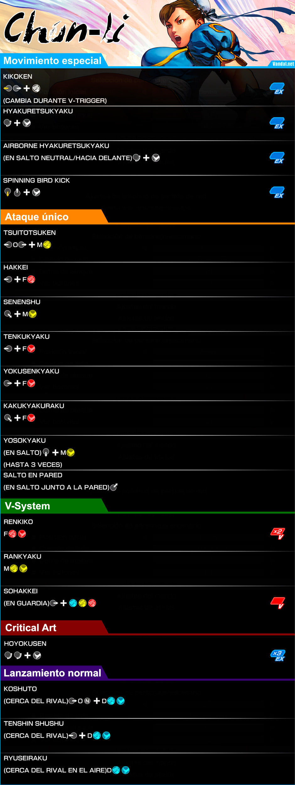 Renkiko: Al cargar sus manos y pies con energía Ki, Chun-Li es capaz de aumentar el número de impactos de sus ataques normales y fuertes. Una acción que permite potenciar los combos de manera sustancial.