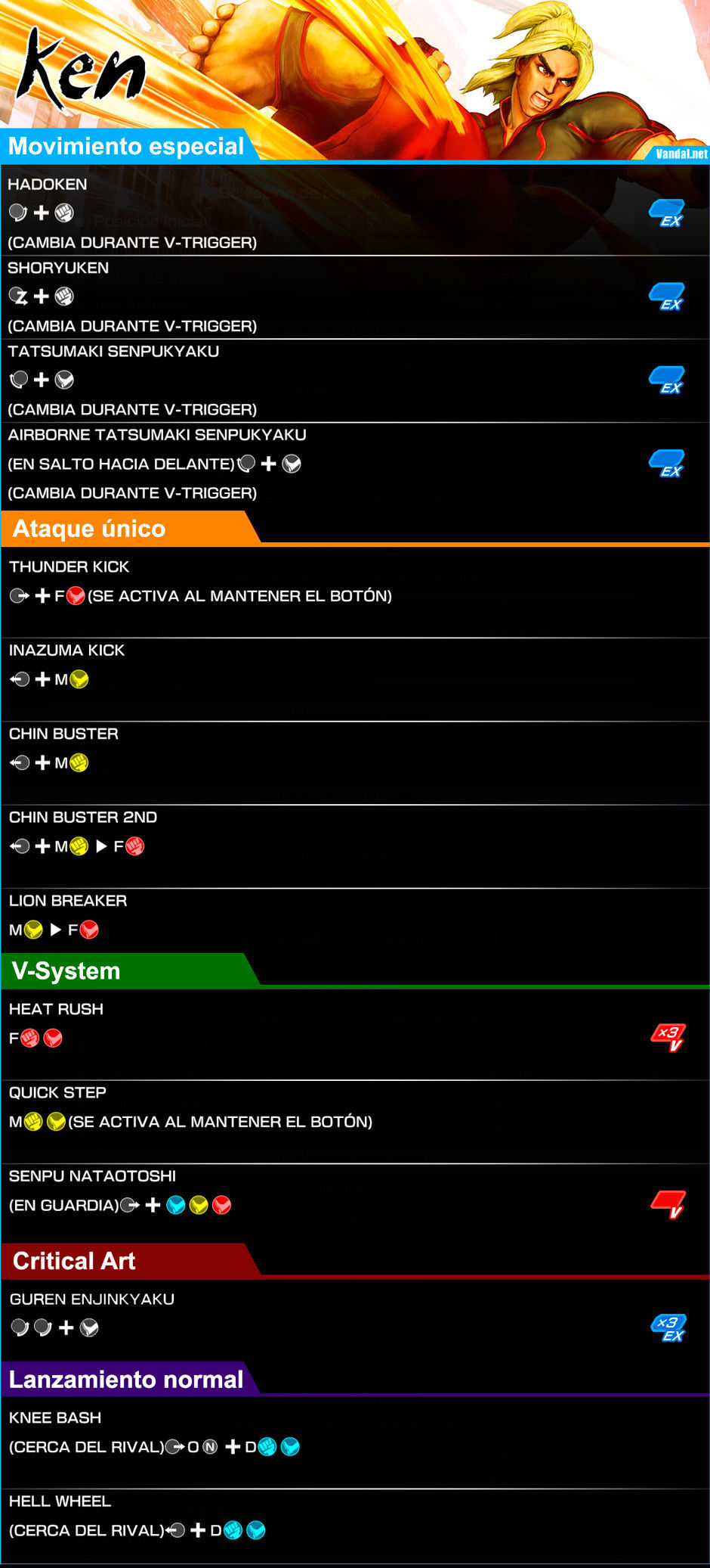 A diferencia de otros personajes, Ken no gasta tiempo de su V-Trigger activo al realizar los Super Moves potenciados, por esto siempre que lo tengamos es bueno activarlo ya sea normal o en combo