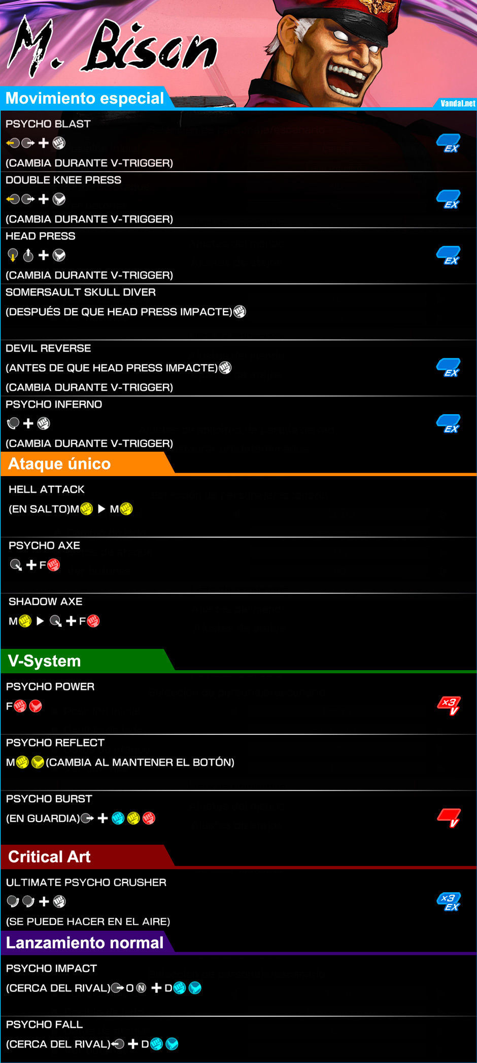Su V-Skill es de los más útiles de todo el juego, ya que no sólo absorbe el proyectil del rival, sino que también puede devolvérselo. Y lo mismo sucede con su V-Trigger, que al activarlo le permite efectuar algunos de sus ataques especiales mientras esquiva automáticamente los proyectiles. Pero su arma más eficaz puede que sea su Psycho Inferno, acción tan contundente como versátil ya que se puede usar en muchos combos y cancels. M- Bison es un luchador realmente poderoso, mucho más orientado al ataque que al juego defensivo.