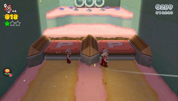 En otra de las cajas hay otra cereza, ahora sois tres. Usa la tubería o las plataformas para subir y entrar en la tubería verde. Al usarla, llegarás a una zona donde ves un "ejército" de enemigos. Si tienes a los dobles con la flor será coser y cantar. Poco después verás que hay dos plataformas-interruptor: usa el obstáculo entre ellas para separar a tus dobles y pulsar ambos a la vez.