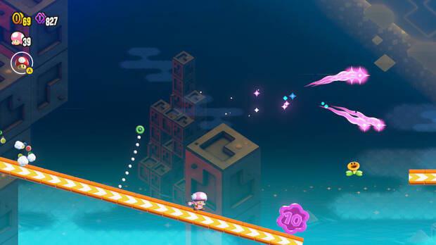 - Si activas la Flor Maravilla: simplemente seguirás un curso distinto de raíles hasta terminar llegando a la meta; antes de esta puedes saltar desde el borde de un raíl elevado para alcanzar lo más alto del banderín fácilmente.