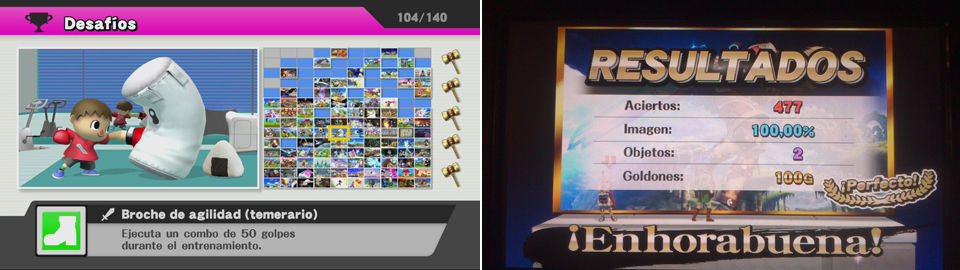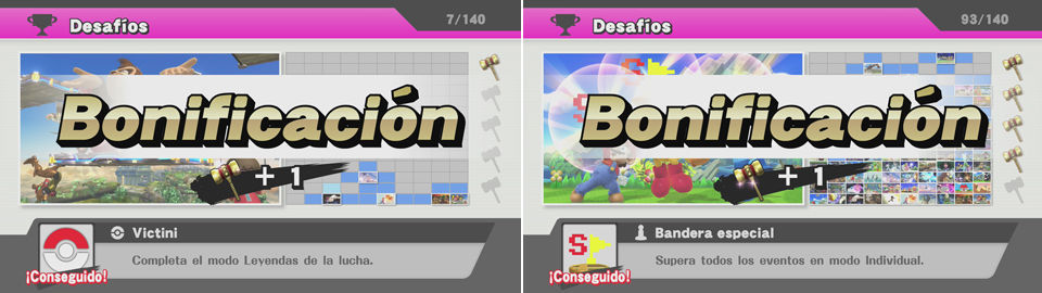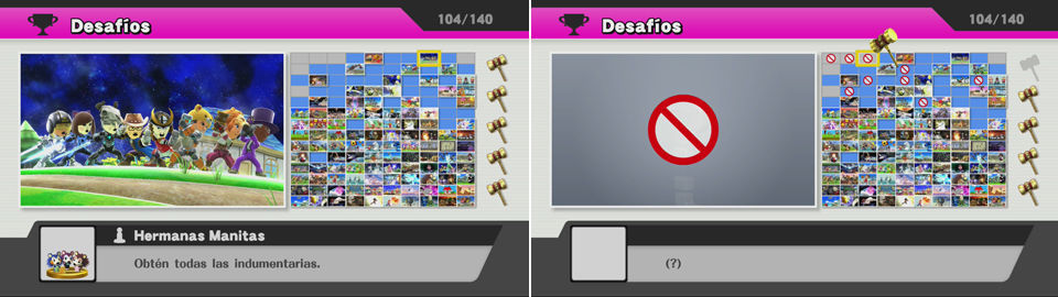 Es importante leer bien lo que nos piden y al no ser que nos lo indiquen, podremos hacerlos jugando a dobles, o con personajes personalizados, o en cualquier nivel de dificultad..Es decir si no nos indican, modo Individual, o sin personalizar o no nos específican el nivel, también tener en cuenta que algunos desafíos son dobles, es decir algunos nos piden algo genérico y luego nos piden lo mismo pero con un personaje en concreto. Atentos para no repetirlo 2 veces, y si lo hacemos con el personaje en concreto desbloquearemos 2 a la vez.