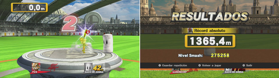 Para mandarlo a más de 1000 m con Ganondorf, según empeiza, Smash lateral, Smash lateral, ambos sin cargar, Smash hacia abajo (tiene que darle los dos golpes), Smash hacia abajo según cae (tiene que darle los dos golpes), Smash lateral, Smash lateral y nos ponemos al lado de espaldas, cargamos puño del hechicero, damos al otro lado para que al final el golpe gire y golpee el saco.