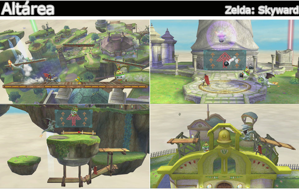 De tour por la isla de Skyward Sword, viajamos por una plataforma larga y pueden cambiar las pequeñas plataformas de arriba, paramos en sitios tan reconocibles, como la estatua de la diosa, la tienda, el tejado con la campana, el alto de la torre y en su base.