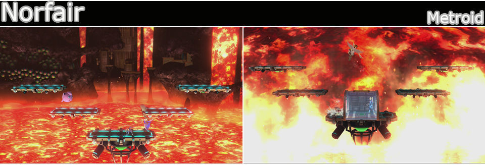 Una zona clásica de Metroid, con una plataforma abajo en el centro y 2 mas altas a cada lado. La marea de lava puede subir y cubrir la plataforma central de abajo, cuidado que no te pille y a intentar tirar a los rivales, también se generan olas de lava por los lados que cubren la mitad del escenario, cuando esto ocurra Smashs laterales, aparte de las olas, también hay lluvias de lava que nos dañan. Por último puede venir una gran ola de lava por el fondo de la pantalla y solo se puede sortear metiendonos en la cápsula que sale sobre la plataforma