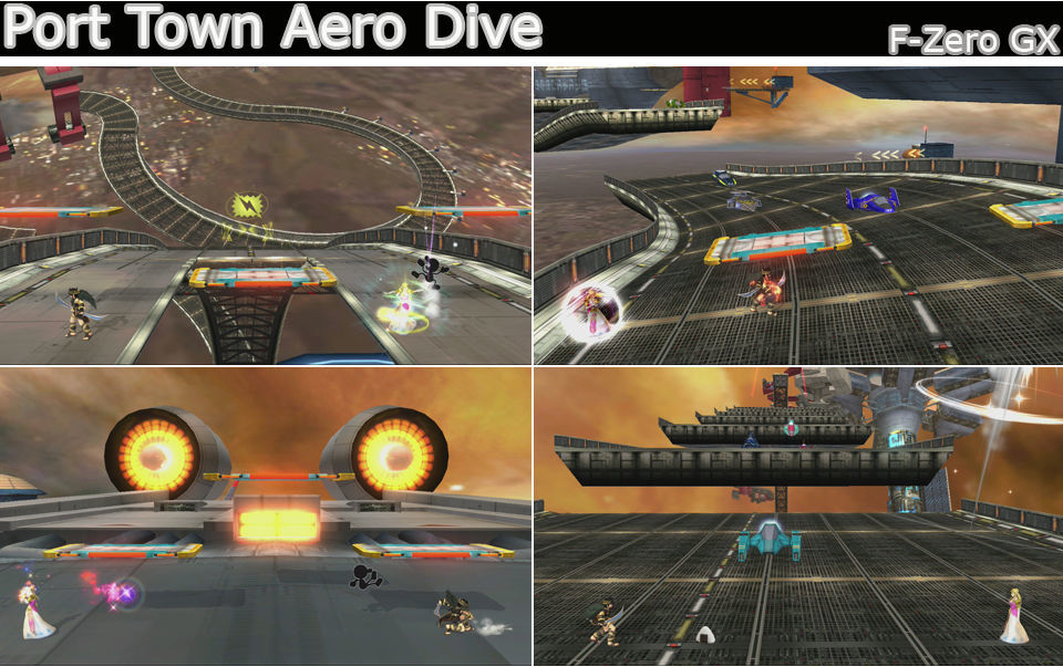 Otro escenario turístico, esta vez por uno de los circuitos de F-zero, atrrizamos en varias zonas donde pasan las naves a toda velocidad, cuidado que no nos den, en la zona con plataformas y un agujero en el centro también pueden darnos aunque estemos sobre las plataformas, en general cuando vienen las naves los bordes son las zonas mas seguras.