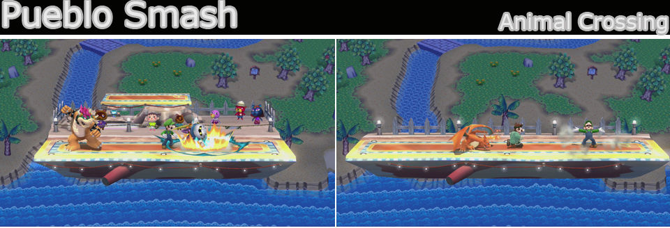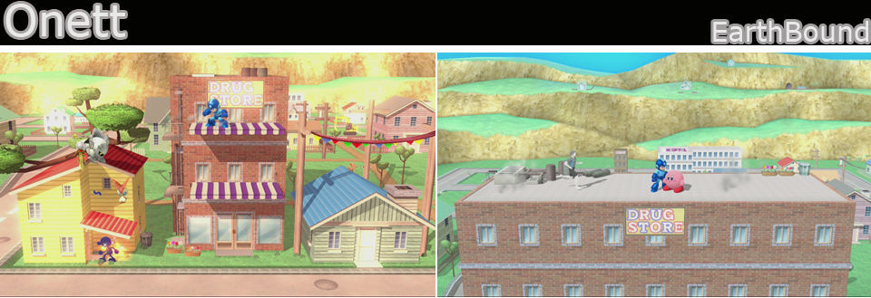 Un escenario sin bordes, mediano y con bastantes plataformas, podemos subirnos a los árboles de la izquierda, al pequeño tejado de la izquierda, sobre los toldos del centro (se caen cuando nos posamos 5 veces) y sobre la casa y la cuerda de la derecha. Por la carretera debajo de vez en cuando pasan coches (se indica con un símbolo) cuidado no nos atropellen, causan un 30% de daño, usa un contrataque sobre ellos y si alcanza a un rival le hará más daño.