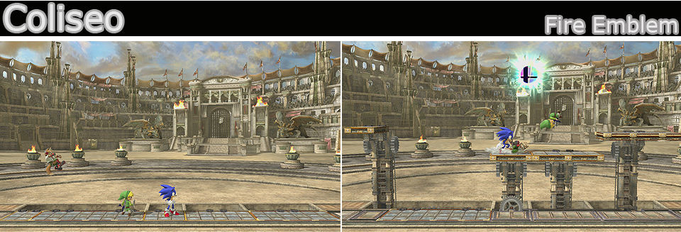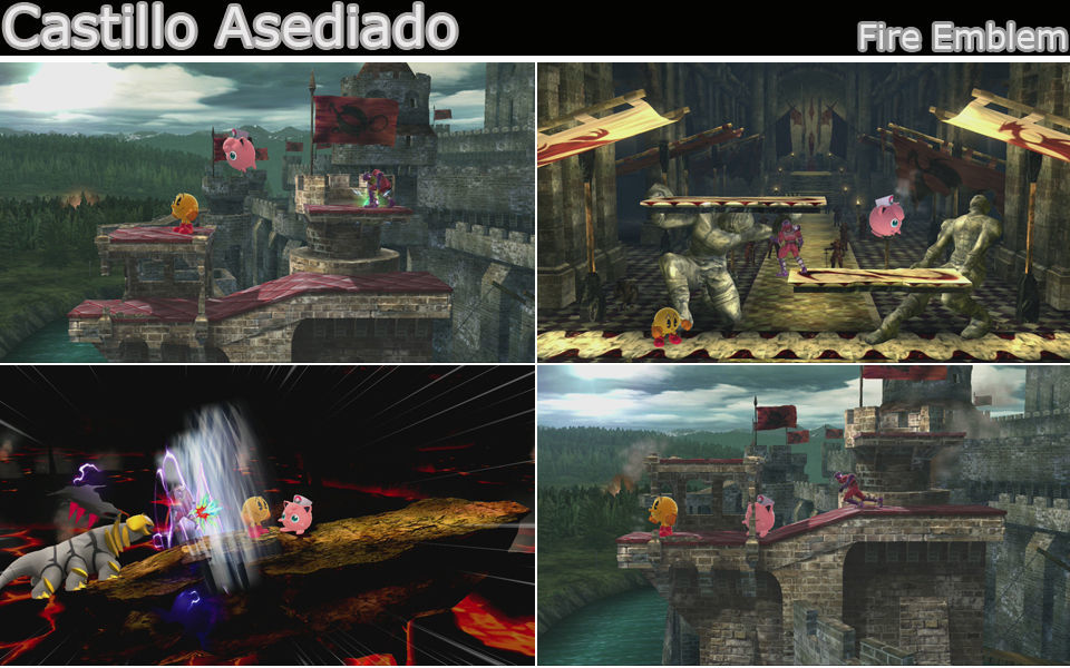 Un escenario de Fire Emblem, con 3 niveles diferentes, comenzamos sobre lo alto del castillo, en un escenario muy pequeño con bordes a los lados y un par de zonas para posarnos a los lados, a tomar la posición central, al cabo de un tiempo caemos a un nuevo escenario, sin bordes, con 2 plataformas inclinadas a los lados y otras centrales sujetadas por estatuas, las estatuas bloquean los disparos, pero con los impactos acabarán por romperse, eso sí la El rayo de la Aurora o los disparos de Genesect si las atraviesan. Tras este descendemos a otro que es una base pequeña con bordes a los lados y sin plataformas, combate cara a cara. Tras este volvemos al comienzo del escenario y se repite.