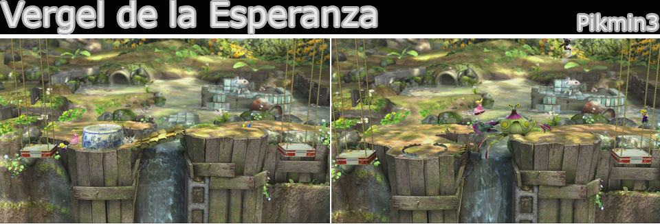 Un escenario amplio con caídas a los lados y otra en medio cuando se rompe el puente, las plataformas de los lados (latas sobre cuerdas) descienden al ponernos sobre ellos así que cuidado, si rompemos la maceta o el puente los pikmins lo reconstruirán y nos pueden atrapar dentro de la maceta, también levantan un tronco en la zona de la derecha que actúa como muro. En algunas ocasiones puede venir un Cepucrenco por cualquiera de los lados y arrasar con los luchadores, atentos a las pompas de agua que indican su llegada.
