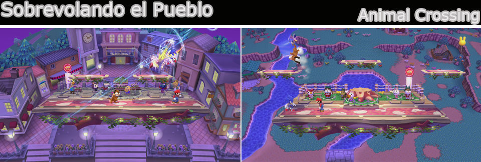 Un escenario en el que vamos volando sobre plataformas por el pueblo de Animal Crossing pero nunca bajamos a ningún sitio, las plataformas sobre la central van variando.