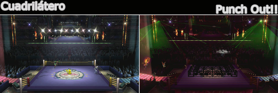 El mítico de Punch Out, aparte del ring a los lados tiene pasarelas en cuesta sin bordes, a Smash cuando estemos aquí. En el ring podemos saltar sobre las cuerdas para impulsarnos y llegar hasta los focos de arriba, si los golpeamos repetidamente los haremos caer y pueden producir efecto meteórico.