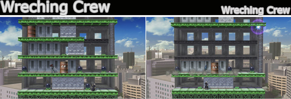 En este escenario tenemos una buena cantidad de pisos que se irán derrumbando a medida que vayamos explotando las bombas (no hacen daño a los luchadores), pero cuidado con los bidones que hay por el escenario que no nos caigan encima al bajar el piso o nos atraparán y pueden golpearnos a merced, si le pasa a alguno Smash a muerte!