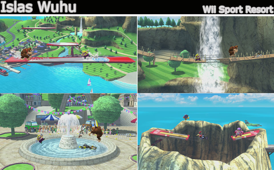 Un tour por la isla de Wii Sports Resort, pero si descendemos. En lo alto de un volcá con plataformas a los lados y agujero en el centro, en una plaza con una fuente en el medio que actúa como muro, en una zona con agua sobre unos focos, en el círculo de la lucha con espada, importante estar atento a los cambios.