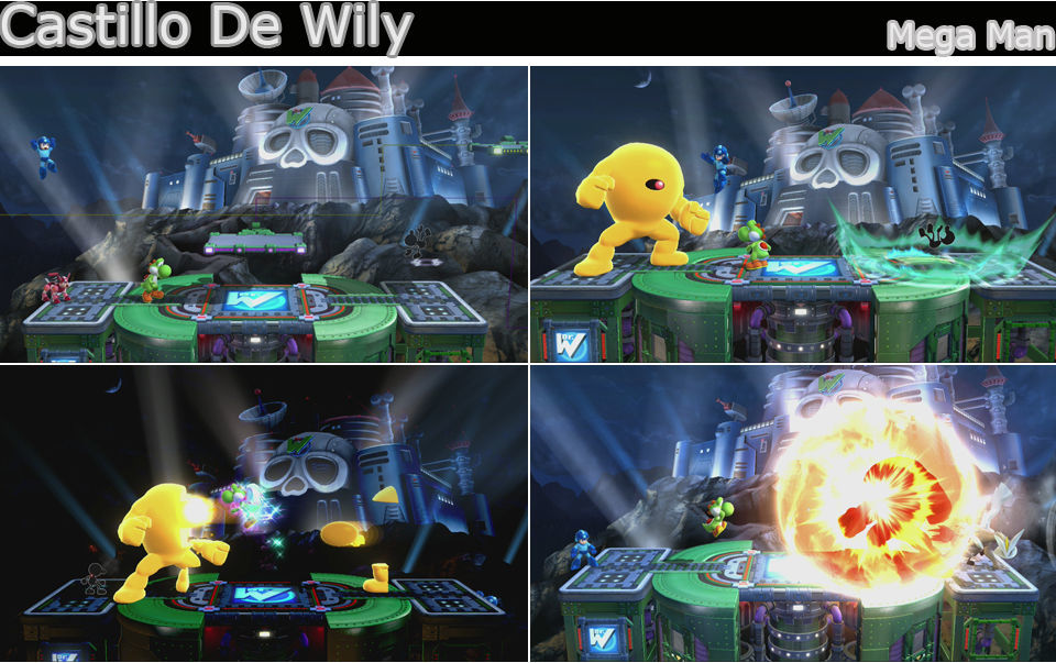 Escenario con Jefe, universo Megaman, una base pequeña con bordes y un par de plataformas que van apareciendo siguiendo las líneas trazadas. A medida que avance el combate aparecerá Yellow Devil.