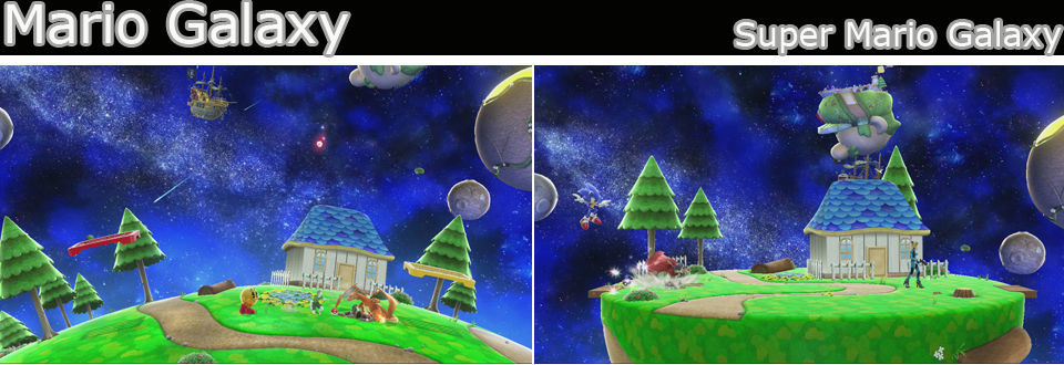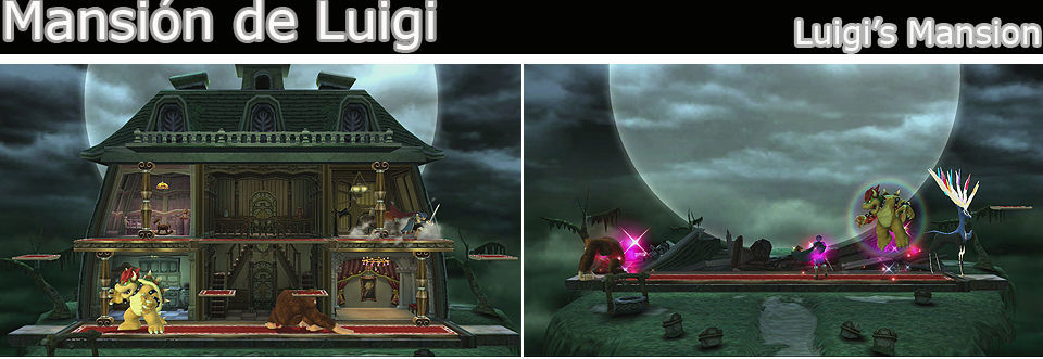 Que grande cuando suena la música principal de Luigi’s Mansión, el escenario es pequeño, con 3 plantas, entre la primera y la segunda solo se puede cruzar por la zona central, a los lados de la mansión pueden salir 1 plataforma pequeña.