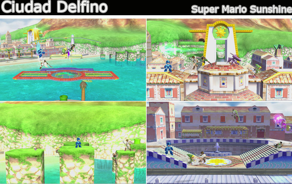 De turismo por Ciudad Delfino, iremos sobre una plataforma grande con plataformas encima que pueden cambiar su distribución, cuando viajemos. Paramos en una playa, en los tejados, en el puerto, en la plaza, en una zona verde con 3 columnas y caídas a cada lado. Muy bonito para recordar el juego de Gamecube.