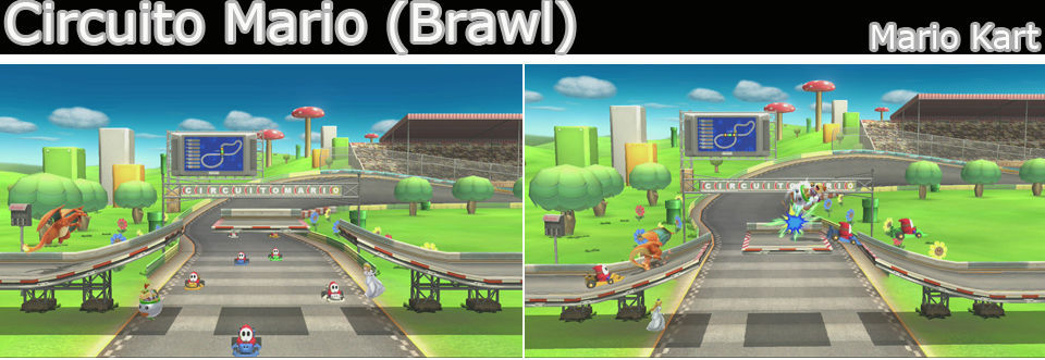 Un escenario muy sencillo y pequeño, pero mítico, las flechas rojas indican por donde pueden venir los Karts. Si vienen por abajo, el ataque es vertical y poniéndonos abajo o a los lados no nos dan, pero por arriba es horizontal, a no ser que saltemos justo, nos darán, lo mejor es irse abajo. Intenta tirar a los rivales contra ellos y remátalos en el aire.