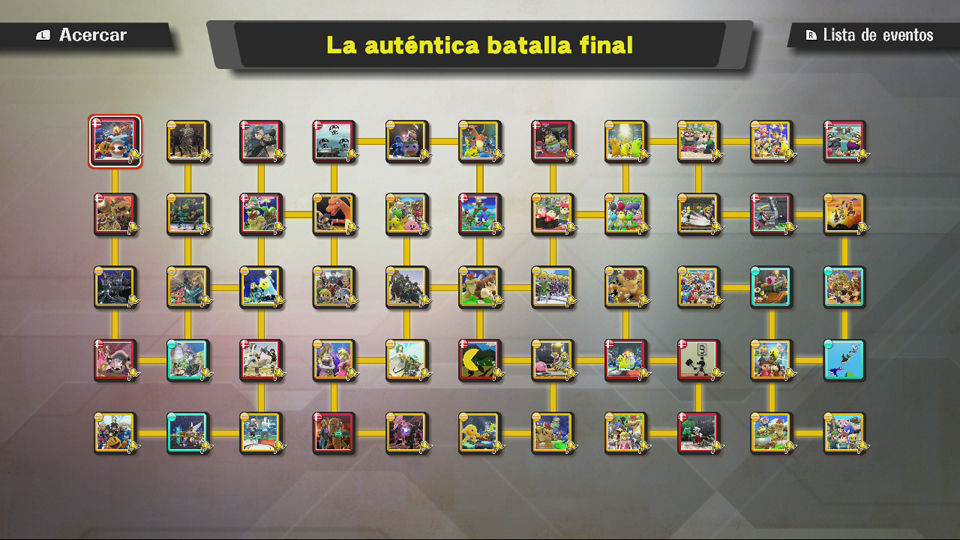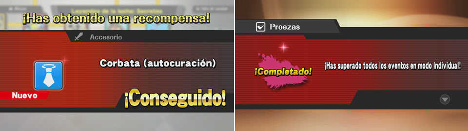 Dentro del cajón de sastre encontramos tanto como en Individual como en Multijugador los Eventos, una serie de pruebas en las que desbloquearemos Accesorios para los personajes, nuevos luchadores e iremos adquiriendo Trofeos, Goldones, Entradas para Retos Crazy Hand a medida que vayamos avanzando.