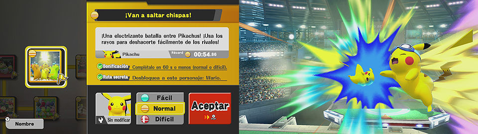Luchamos contra 3 Pikachus que han tomado un champiñón y son grandes, durante el combate van saliendo rayos para hacerles pequeños, hay que anticiparse para que no lo cojan ellos, fácil para conseguir la bonificación