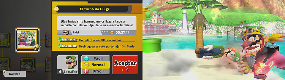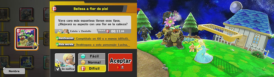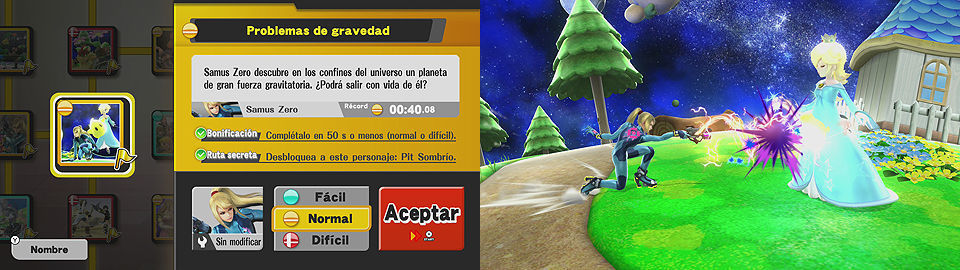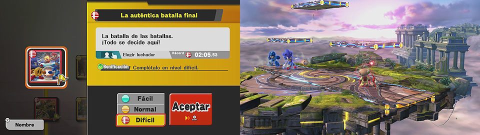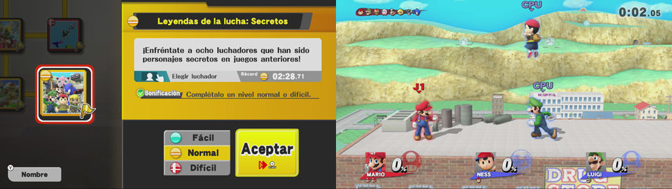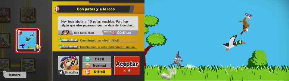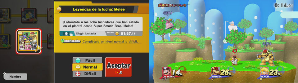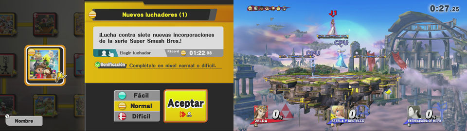 Luchamos contra, Estela y Destello, Entrenadora de Wii Fit, Little Mac, Aldeano, Duck Hunt, Bowsy y Lucina. Podemos elegir luchador