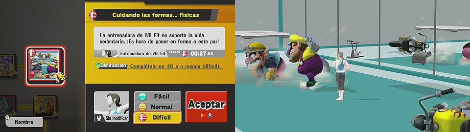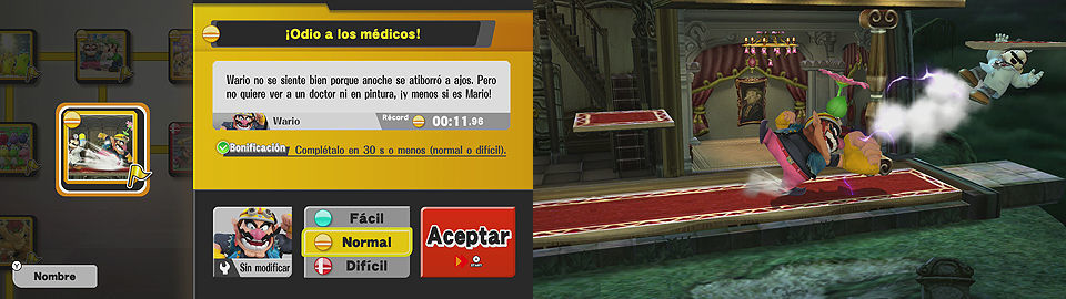 Nos enfrentamos con 2 Warios que se han comido un champiñón y son grandes, además durante el combate van saliendo ítems de comida continuamente y los enemigos irán a por ellos como posesos, para conseguir la bonificación, hay que atosigarles continuamente y evitar que recuperen salud, por su tamaño si les golpeamos cerca de los bordes latarales, les echaremos sin tener que recurrir a un Smash cargado al máximo, con un Smash medianamente cargado o un ataque en carrera al lado de los bordes lo conseguiremos, la magia hacia debajo de la Entrenadora de Wii Fit permite aumentar la distancia de lanzamiento