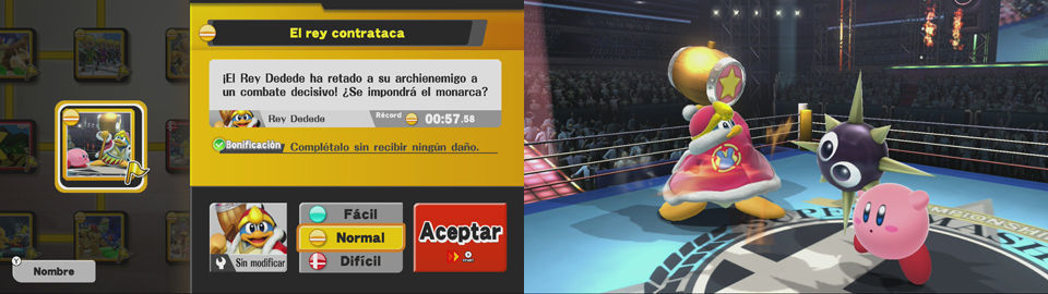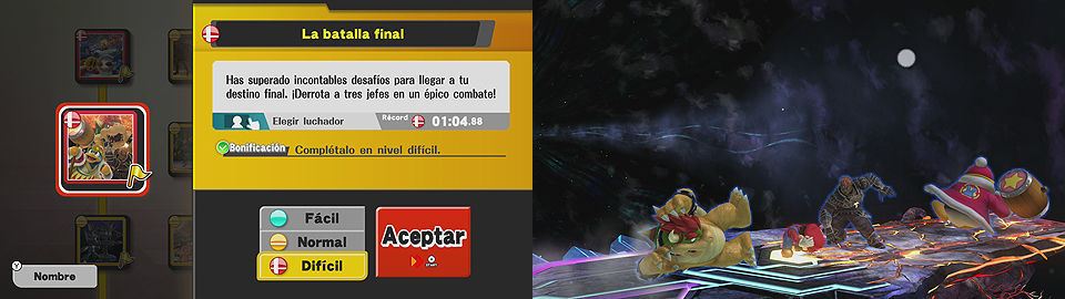 Una lucha contra Bowser, Ganondorf y el Rey Dedede, podemos elegir personaje, así que a pedirnos al que mejor se nos dé y a cubrirse bien y realizar esquivas, los enemigos están en nivel elevado, atentos al Rey Dedede y sus martillazos