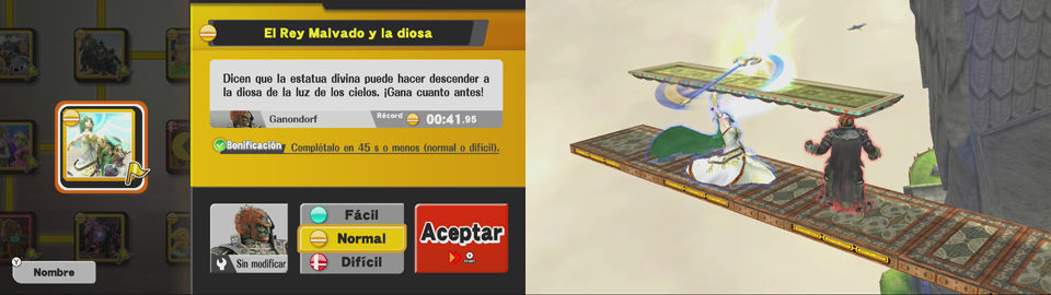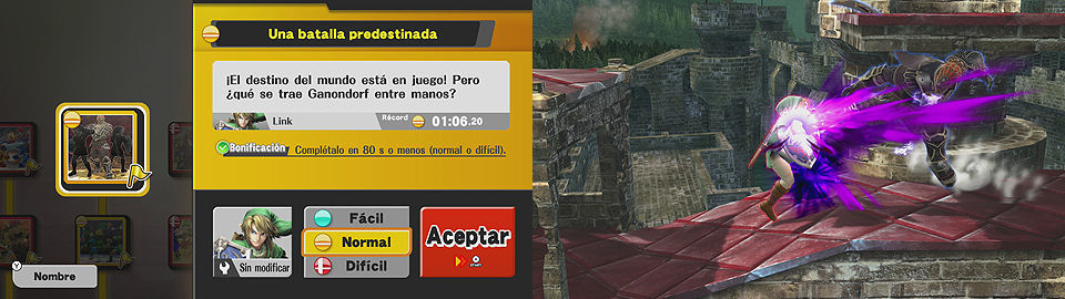 Nos enfrentamos a Ganondorf siendo Link, 2 vidas cada uno, si llegamos hasta el tercer piso se le unirán 2 links oscuros, aunque para hacer la bonificación no debemos verles, así que a aniquilar a Ganondorf