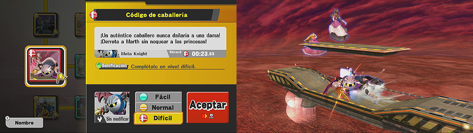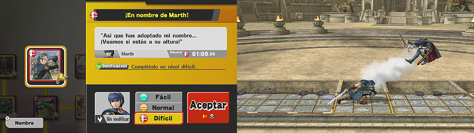 Nos enfrentamos a Lucina en el escenario "Coliseo", para conseguir la bonificación hay que superarlo en nivel difícil, cuidado con los contras de Lucina y con atacarla desde arriba, nos esperará con un Smash hacia arriba, a cubrirse bien realizar esquivas y Marth también tiene contra, nuestro ataque de magia lateral es muy bueno para golpearla, recordad que hay que seguir pulsando el botón para que realice el combo