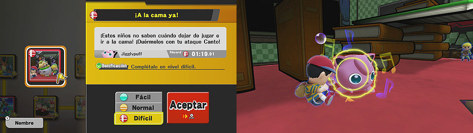 Controlamos a Jigglypuff contra Bowsy, Ness y Toon Link, usando la magia hacia arriba tenemos que dejar dormidos a los 3, muy sencillito de conseguir