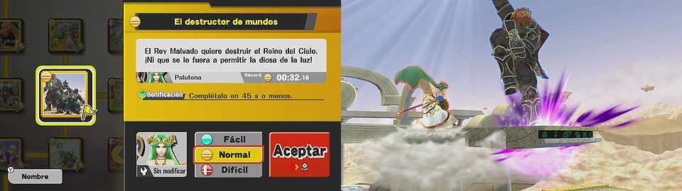 Con Ganondorf nos enfrentamos a Zelda y Link, cuando acabemos con ellos 2 saldrá Palutena con efecto Champiñón. Para completar la bonificación, hay que castigar a Link y Zelda sin piedad, cuando llevemos 30 s tenemos que estar ya contra Palutena, Ganondorf es un personaje que inflige mucho daño, así que a sacarlos rápido y según salga Palutena Smash hasta eliminarla