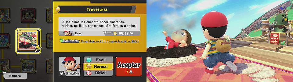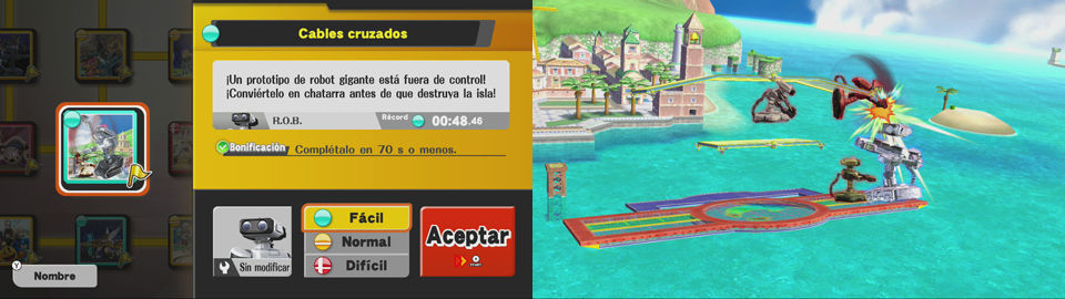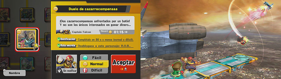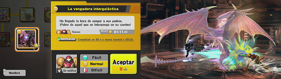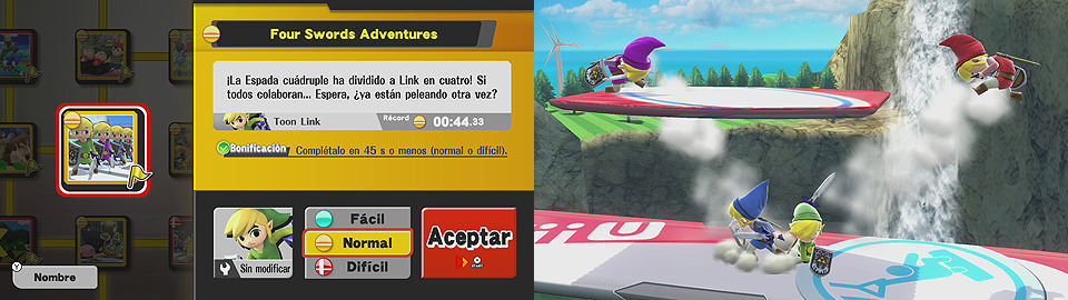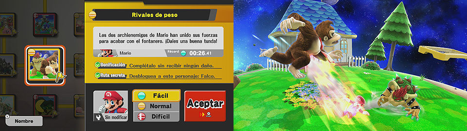 Nos enfrentamos a Donkey, Link, Samus, Yoshi, Fox, Mario, Pikachu y Kirby. Podemos elegir luchador, la bonificación simplemente nos piden que lo completemos así que no nos costará lo mas mínimo