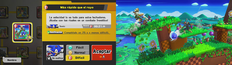 Falco, Fox, Captain Falcon y Sonic, controlamos al Erizo de Sega, todos los luchadores se mueven a una velocidad superior a la normal, ls ataques rodantes de Sonic nos vienen muy bien para completar la bonificación y como no los Smash cargados a tope