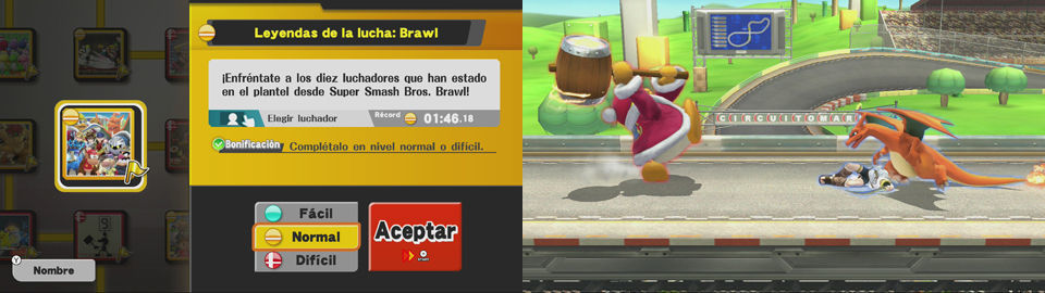 Pit, Charizard, Samus Zero, Wario, Diddy Kong, Ike, Meta Knight, Rey Dedede, Olimar y Lucario. Podemos elegir personaje.