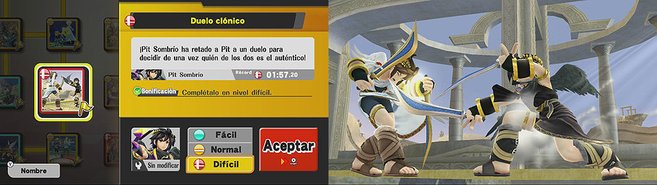 Luchamos contra Shulk, Greninja, Pac-Man, Megaman, Daraen, Palutena y Pit Sombrío, podemos elegir luchador