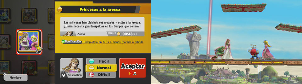 Smash por equipos, Zelda y Link contra Peach y Mario, controlamos a Zelda, un Evento en el que no hay nada que comentar, derrotar a ambos en menos de 60 segundos no nos llevará mucho esfuerzo, a Smashear y listo