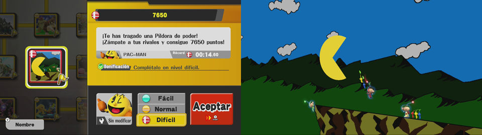 Somos Pac-Man y comenzamos el Evento con una bola Smash, hay que realizar el Smash final de Pac-Man y zamparse a 6 enemigos para llegar a la puntuación 7650, los pobres enemigos son varios Olimar, para completar la bonificación, esperamos un pelín antes de activarlo y poder comernos así a 2 según lo hagamos, para que nos de tiempo a no tener que volver a activar el Smash final si se nos agota (aparte que ya no da tiempo)