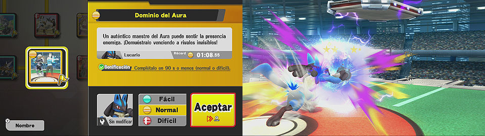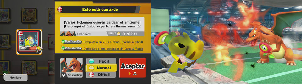 Somos Charizard y hay que acabar con Greninja, Lucario y Pikachu en menos de 70 s, cada uno aparece solo, cuando eliminemos a uno sale el siguiente, además salen flores de fuego, Curri y Barreras de fuego, hay que evitar sobre todo que cojan el curri lo que nos entorpece bastante para cumplir la bonificación y si sale una barrera de fuego a por ella y a dar Smashs
