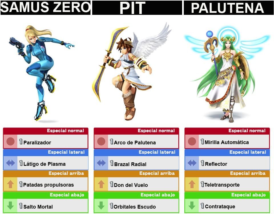 Smash: largo alcance, Palutena hacia arriba crea una columna de luz bastante alta, hacia delante golpea con sus alas y hacia abajo golpea también con sus alas a la vez hacia ambos lados.