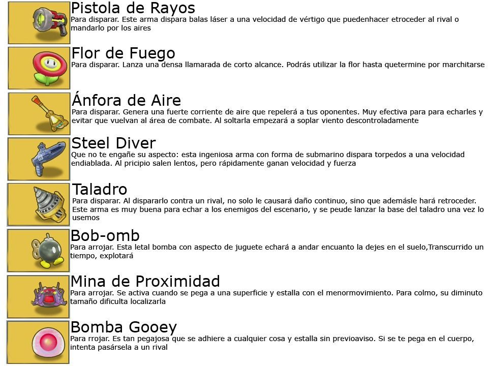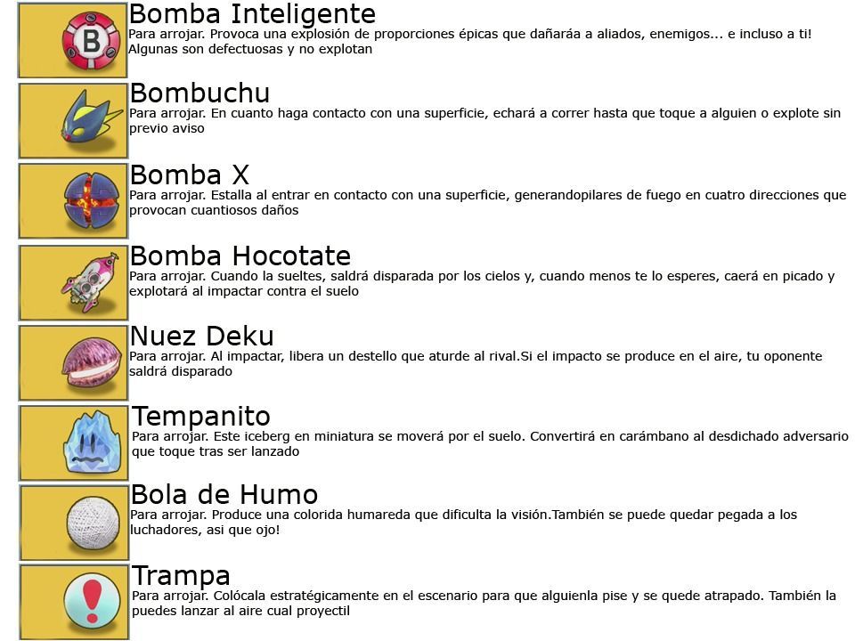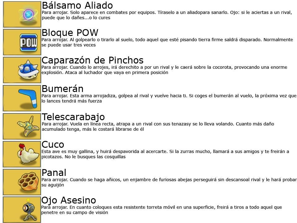 Para arrojar. Cuando lo arrojes, irá derechito a por un rival y le caerá sobre la cocorota, provocando una enorme explosión. Ataca al luchador que vaya en primera posición Bumerán. Para arrojar. Esta arma arrojadiza, golpea al rival y vuelve hacia ti. Si coges el bumerán al vuelo, la próxima vez que lo lances tendrá más fuerza.