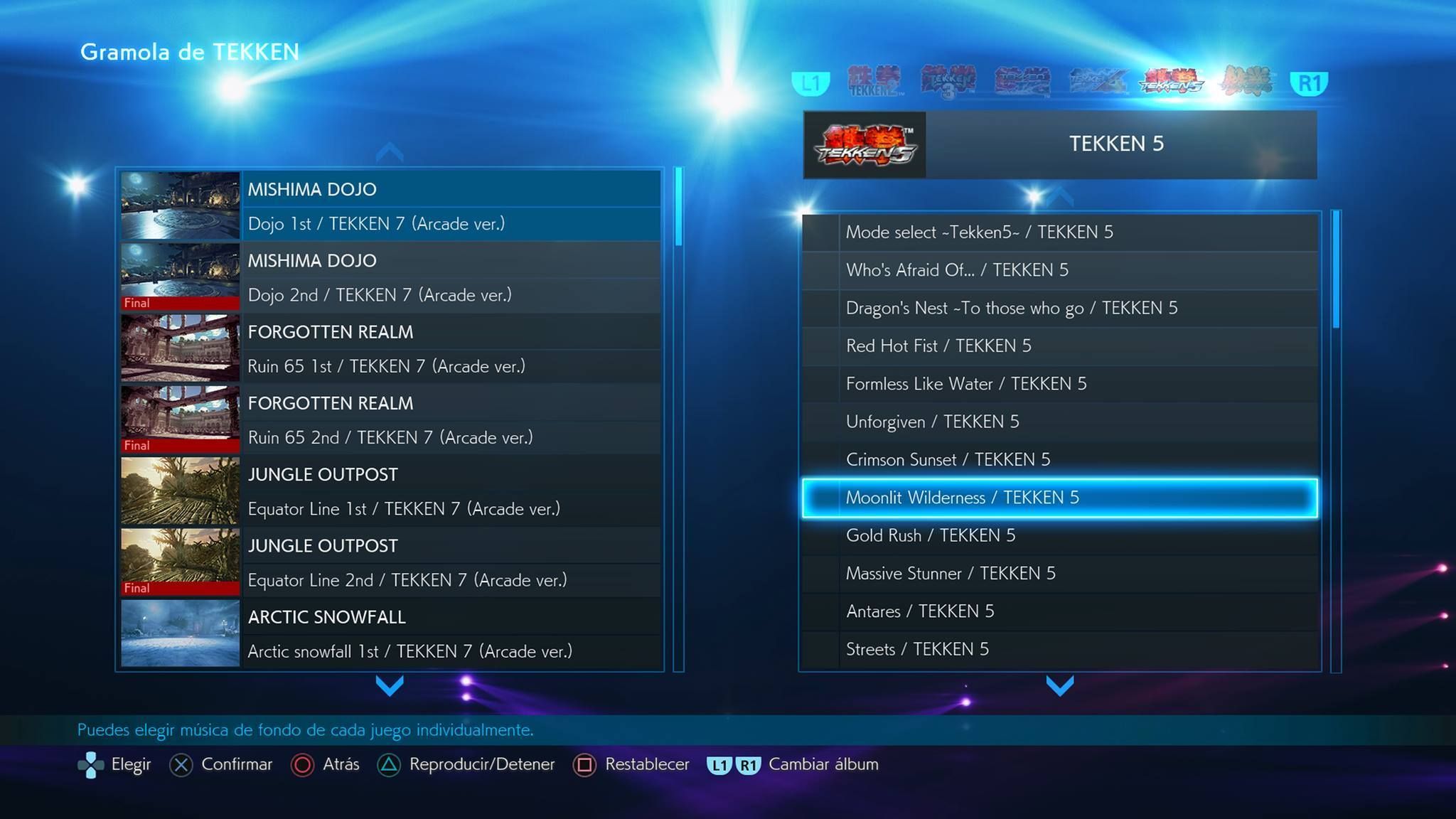Personaliza la banda sonora del juego con los temas de la saga. Podrás cambiar la música de los escenarios por la de cualquier Tekken, desde el primero hasta Revolution. Hay varios listados predefinidos pero también puedes escoger temas de cada juego.