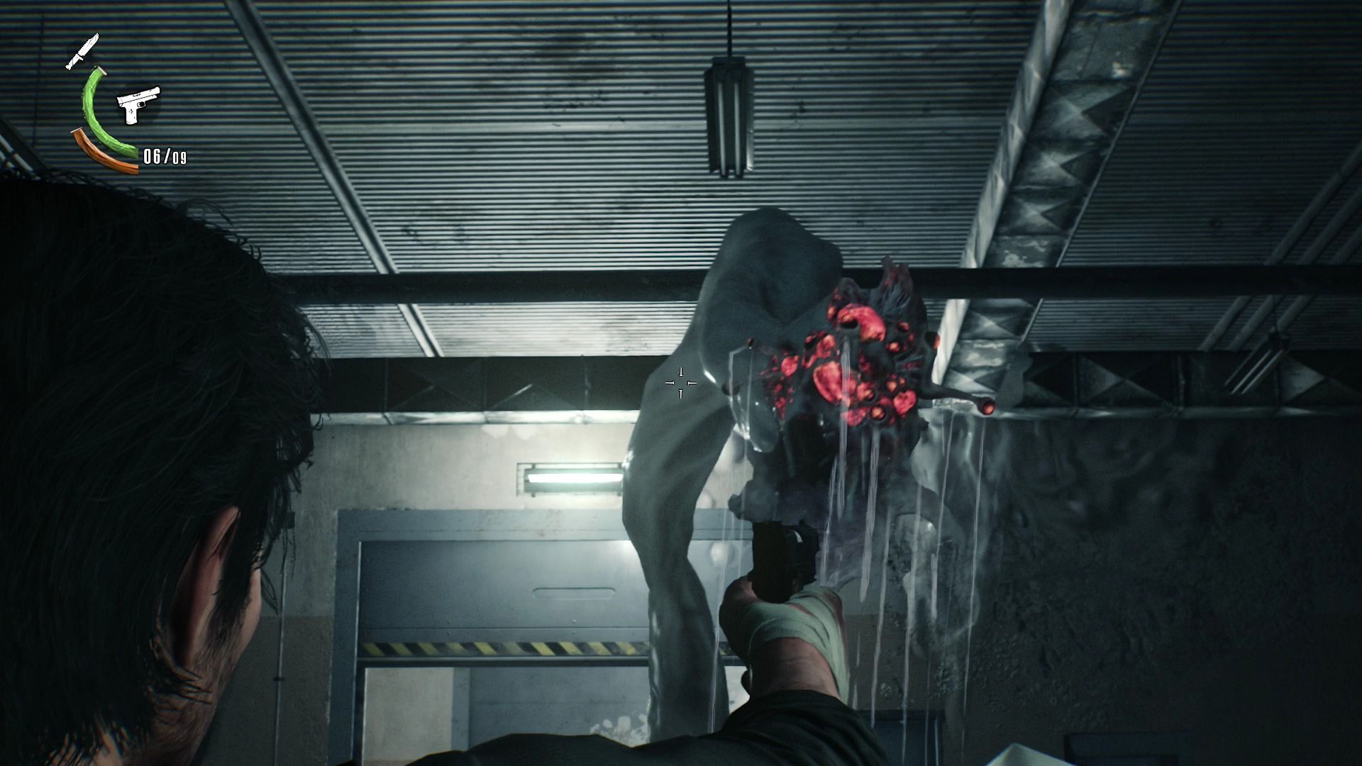 En este primer combate eres libre de pasar corriendo por la zona de la derecha para avanzar por la puerta de más al fondo, de esta forma no gastarás munición. Si quieres enfrentarte al jefe deberás dispararle a los bultos de color rojo que tiene en la cara un par de veces para que le aparezca un bulto más grande en el que tendrás que centrar tus disparos. Cuando el jefe se quede inmóvil en la parte central quedará derrotado.