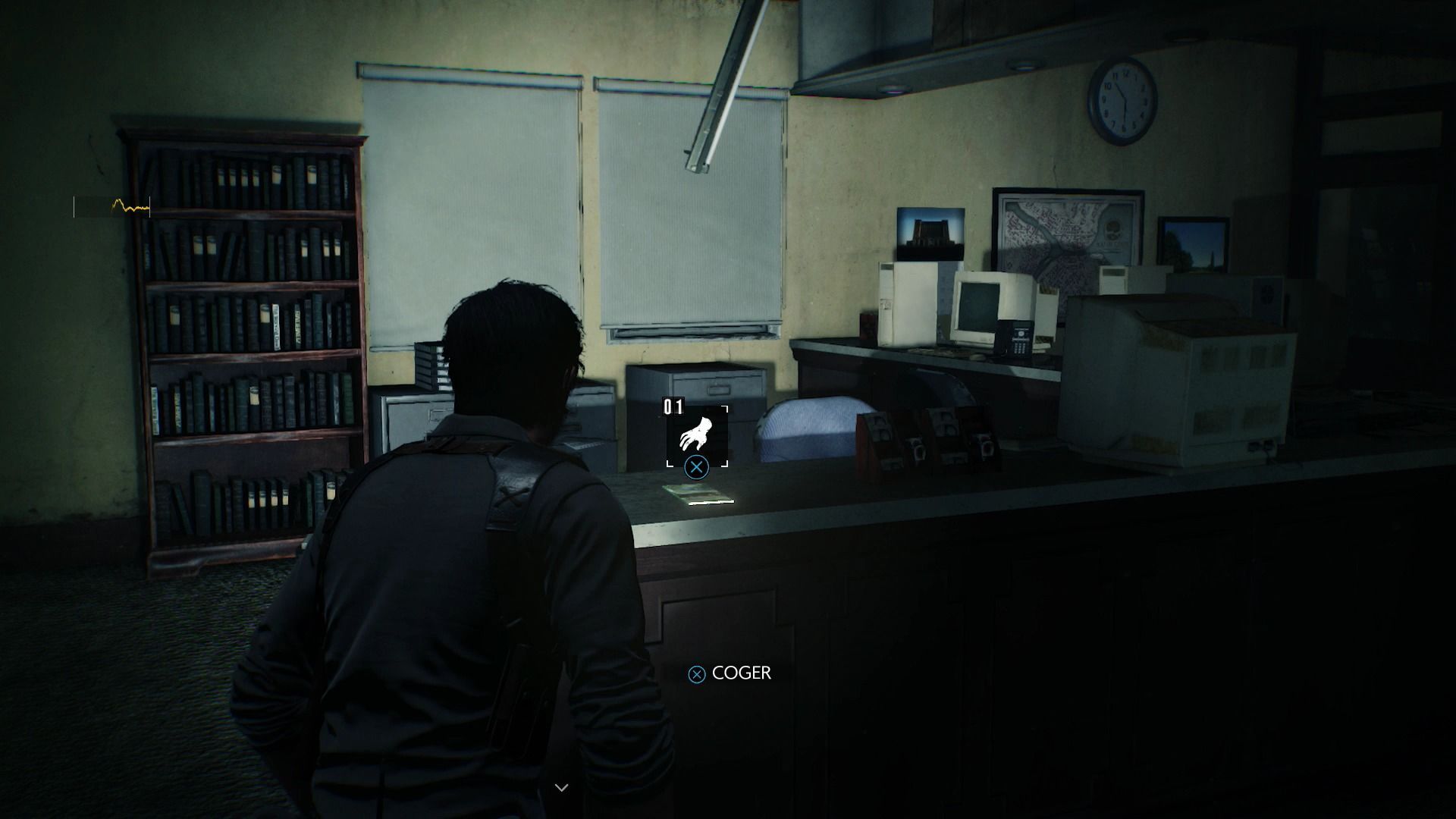 Tras recoger el coleccionable anterior avanza por el túnel hasta llegar a otro pasillo. Según llegas entra por la puerta de la derecha y mira encima del escritorio que verás a tu derecha.