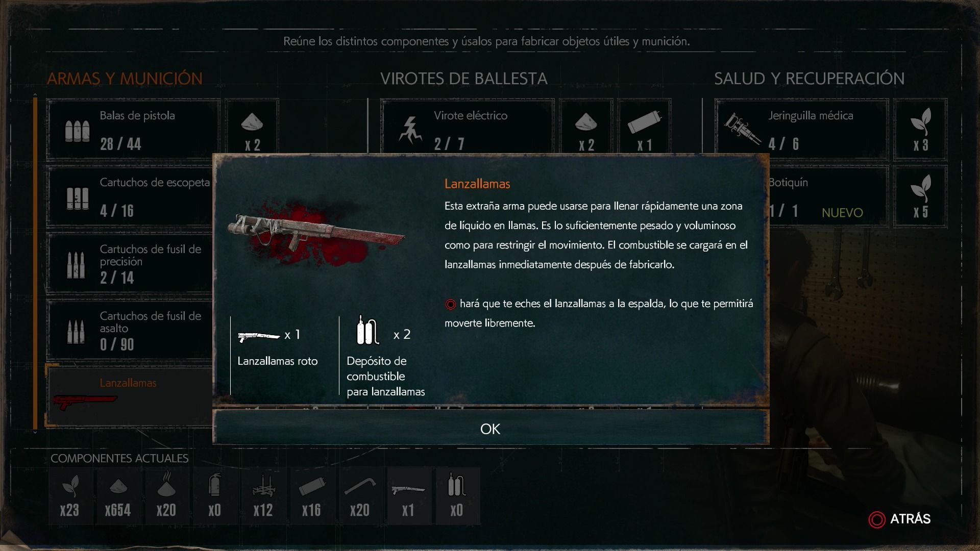 - Componentes necesarios: Lanzallamas roto x1, Depósito de combustible para lanzallamas x2.