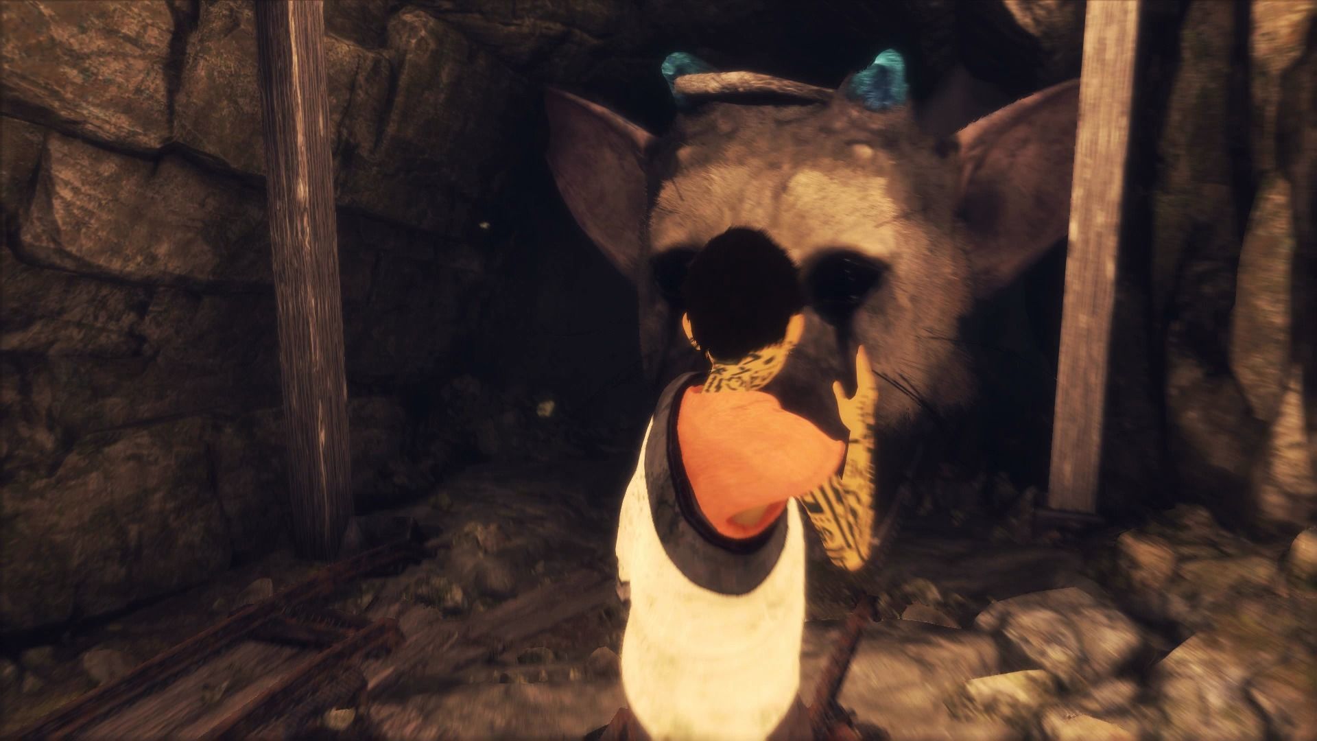 Tras despertar y recibir unos arrumacos de Trico, volvemos a la zona donde nos engulló, y nos subimos a Trico para seguir de frente. Bajamos unas escaleras y activamos un interruptor, para que Trico nos siga, y llegamos hasta una mina. Aquí entramos por el único camino disponible, y al llegar al fondo, llamamos a Trico, quien se meterá arrastrando, a duras penas. Cuando su cabeza haya llegado, nos subimos y ya podemos escalar hasta la parte de arriba.